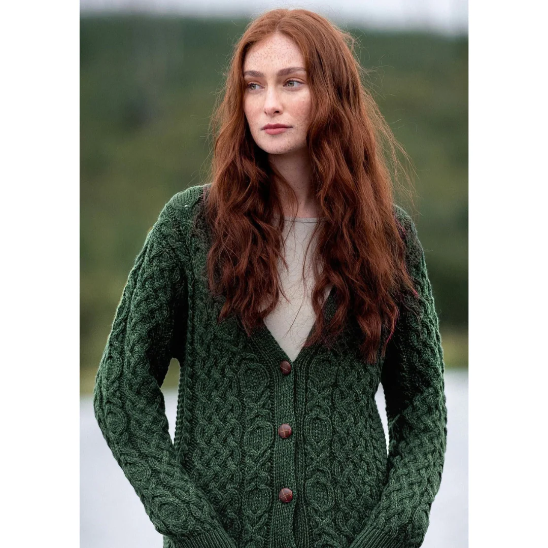 Stay cozy and stylish with our Ladies Aran Boyfriend Cardigan, crafted from 100% Merino Wool. Featuring a deep V-neck and a slightly longer fit for added comfort, it’s perfect for pairing with leggings for an effortlessly chic look.