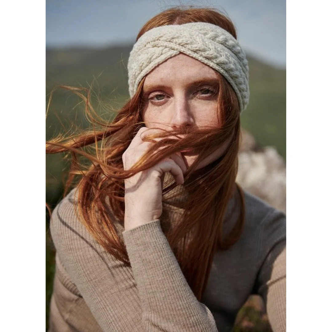The Soft Aran Crossover Headband offers a stylish twist on traditional Irish knitwear. Made from 100% Merino wool, it features classic rope cable stitches with ribbed detailing and a chic crossover design. Soft, warm, and breathable, this natural-toned headband makes a perfect gift or cozy accessory for cooler days.