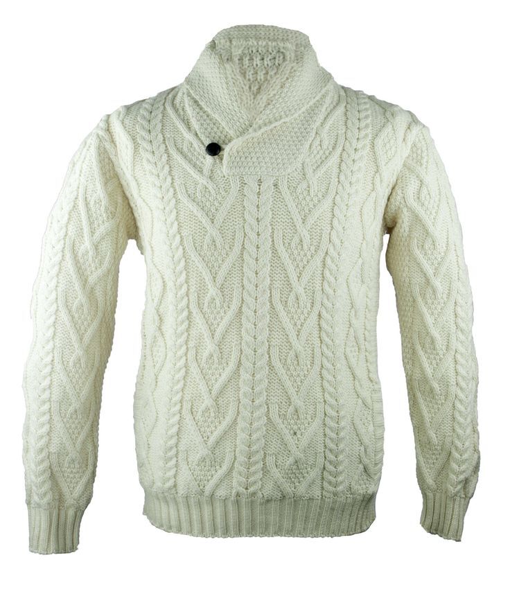 The Men's Shawl Collar Aran Jumper blends timeless Irish craftsmanship with comfort. Made in Ireland from 100% super soft Merino wool, it features classic diamond and cable Aran patterns and a stylish shawl collar for a refined yet cozy look.